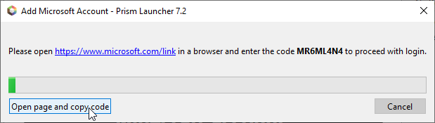 Press the button on the prompt to copy the code and open the login page in the browser ℹ
