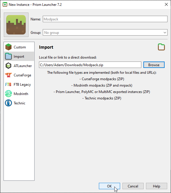 Select "Import" on the left and select the modpack *.zip file you downloaded previously ℹ