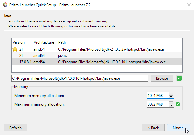 Select the correct version of Java and choose a reasonable amount of memory to assign to Minecraft (>1024